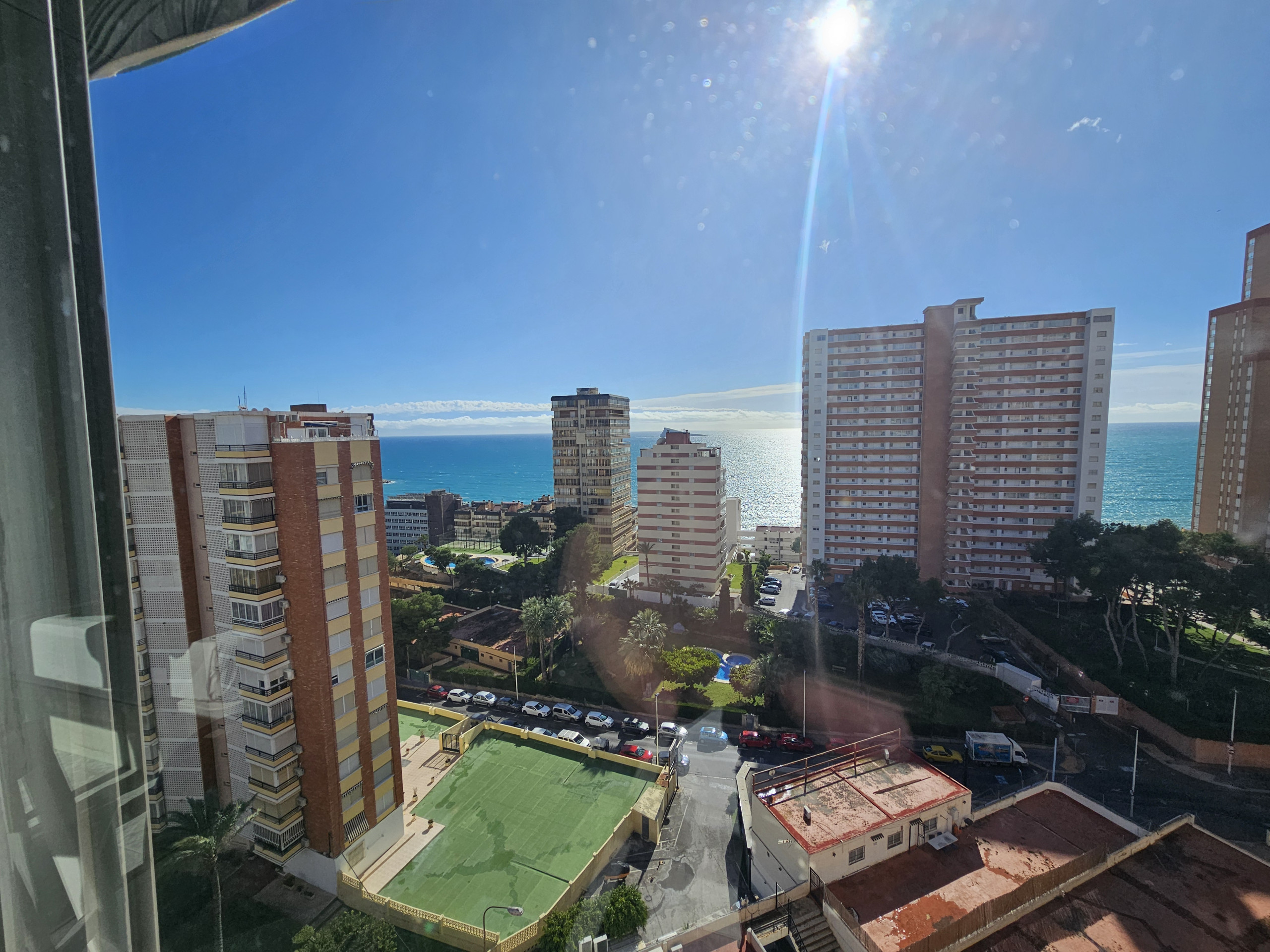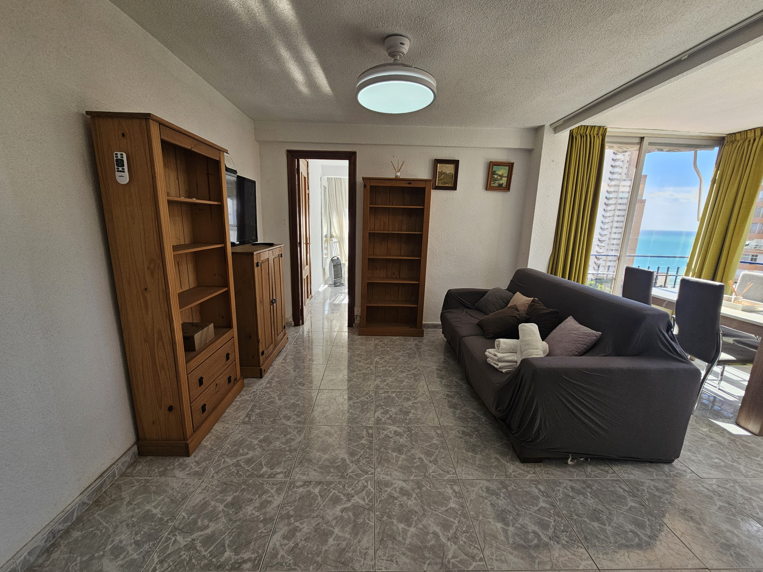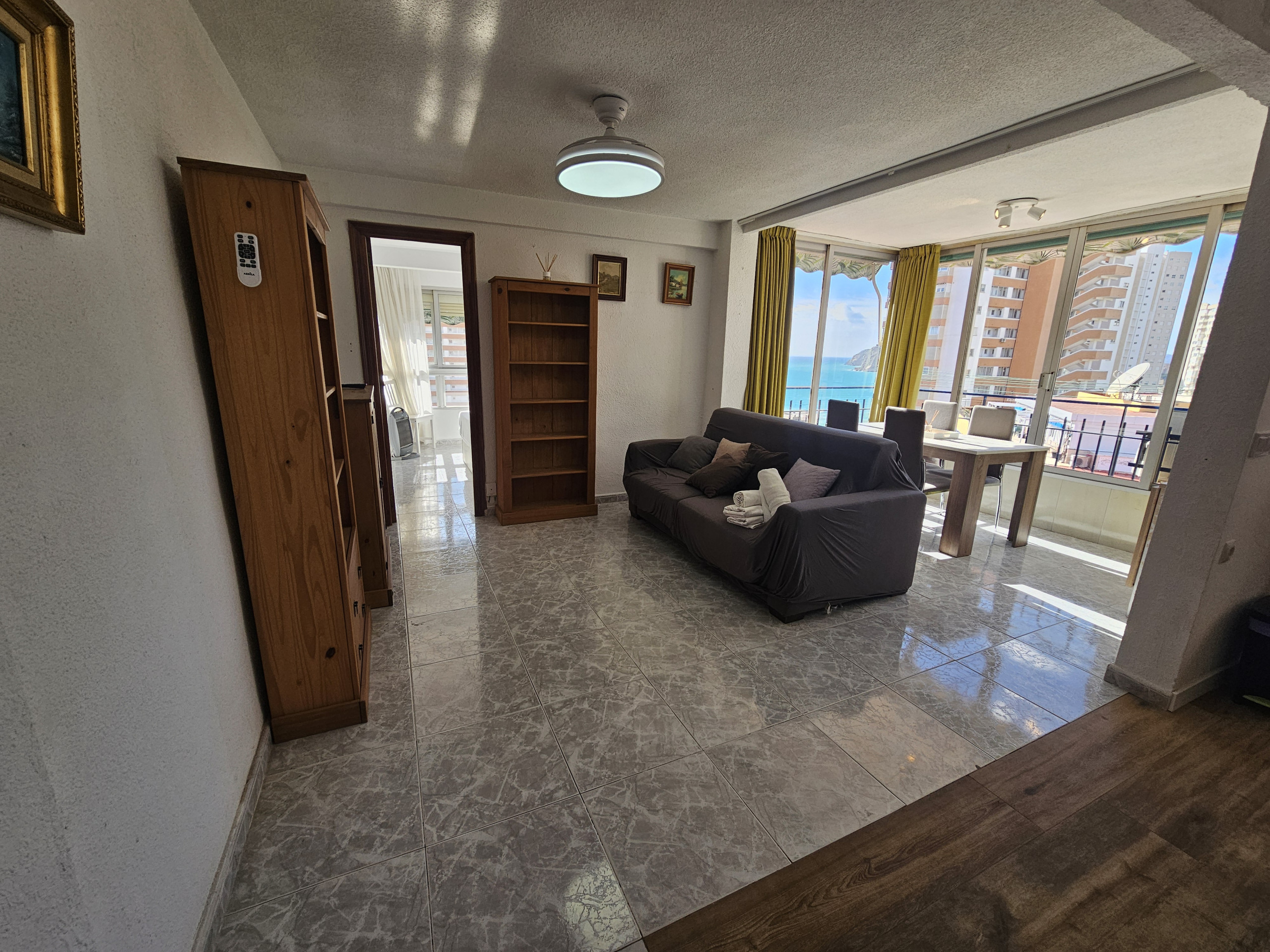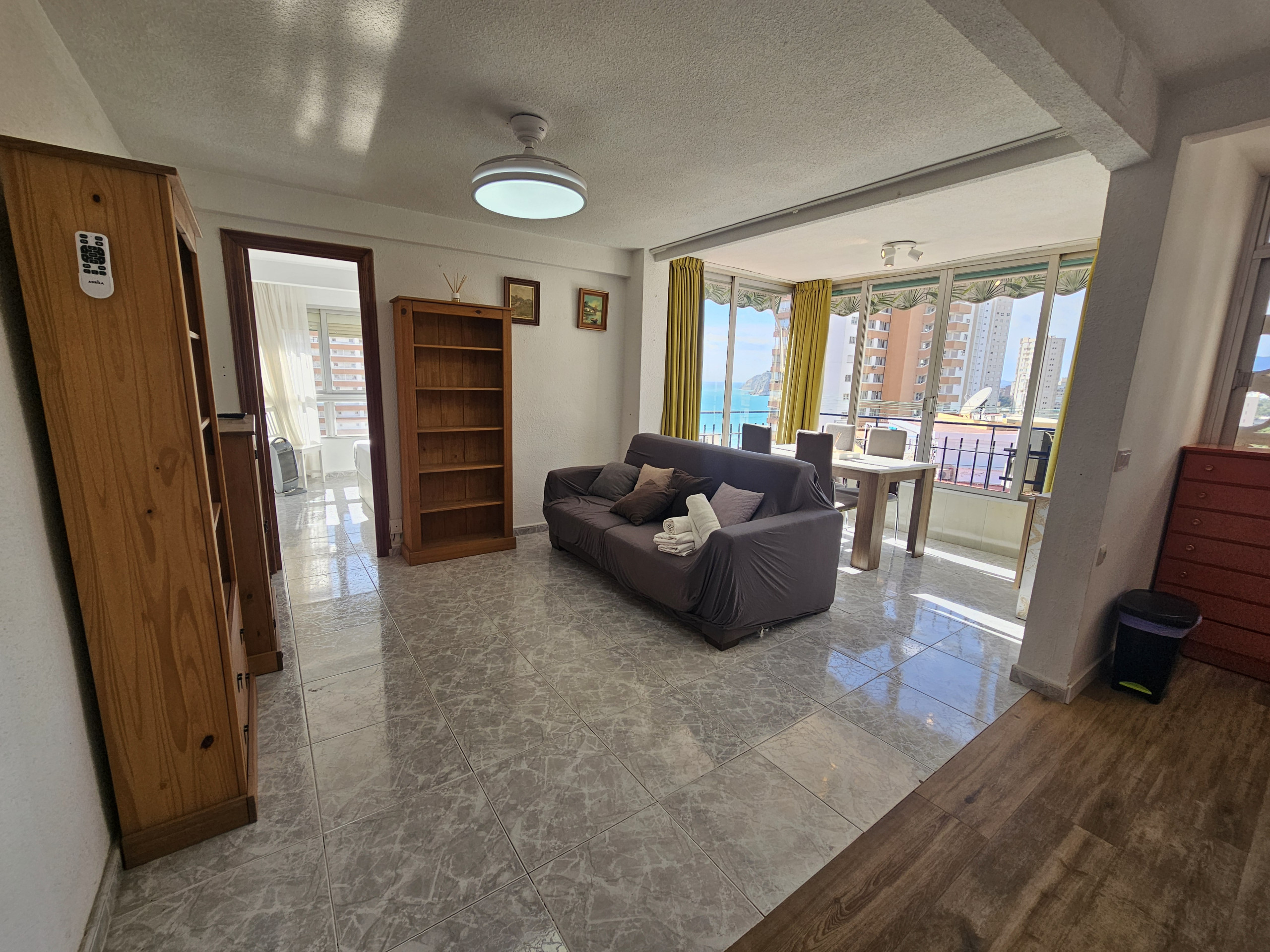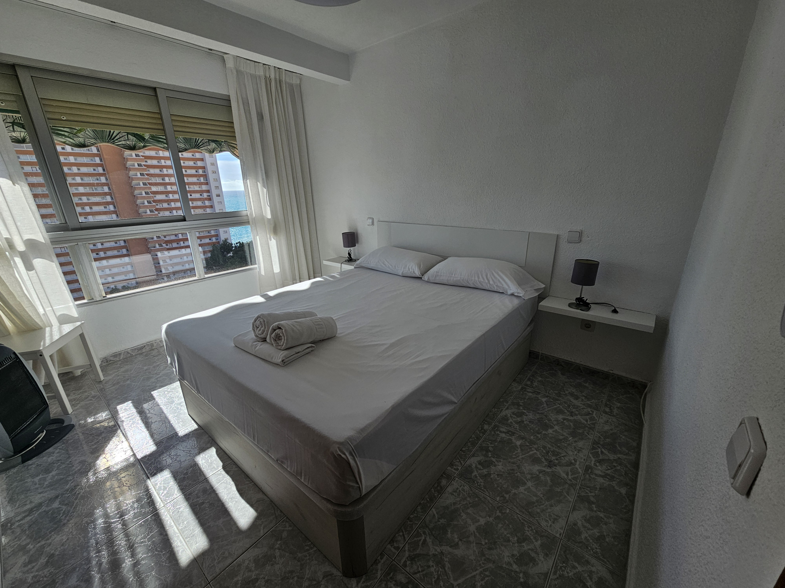 El apartamento en Benidorm posee 1 dormitorio(s) y capacidad para 4 personas. Alojamiento de 44 m² acogedor y totalmente equipado, con vistas al mar. Se encuentra a 0 m del supermercado, 0 m del hospital, 0 m del parque, 250 m del restaurante, 250 m de la cafetería, 300 m de la playa de arena "PLAYA PONIENTE", 900 m de la ciudad "CASCO ANTIGUO", 3 km del parque de atracciones "TERRA MITICA", 4 km de la estación de autobuses "ESTACION DE BENIDORM", 5 km del parque acuático, 5 km del parque natural "SIERRA HELADA", 45 km de la estación de tren "ESTACION ALICANTE", 57 km del aeropuerto "ALTED ALICANTE", 57 km del aeropuerto internacional "ALTED ALICANTE" y está ubicado en una zona tranquila y en el complejo residencial.Dispone de ascensor, lavadora, plancha, acceso internet (wifi), secador, aire acondicionado, piscina comunitaria+infantil, parking aire libre en mismo edificio, 1 ventilador, 1 Televisor.La cocina americana, de vitrocerámica, está equipada con nevera, microondas, congelador, vajilla/cubertería, utensilios/cocina, cafetera, tostadora y hervidor de agua.