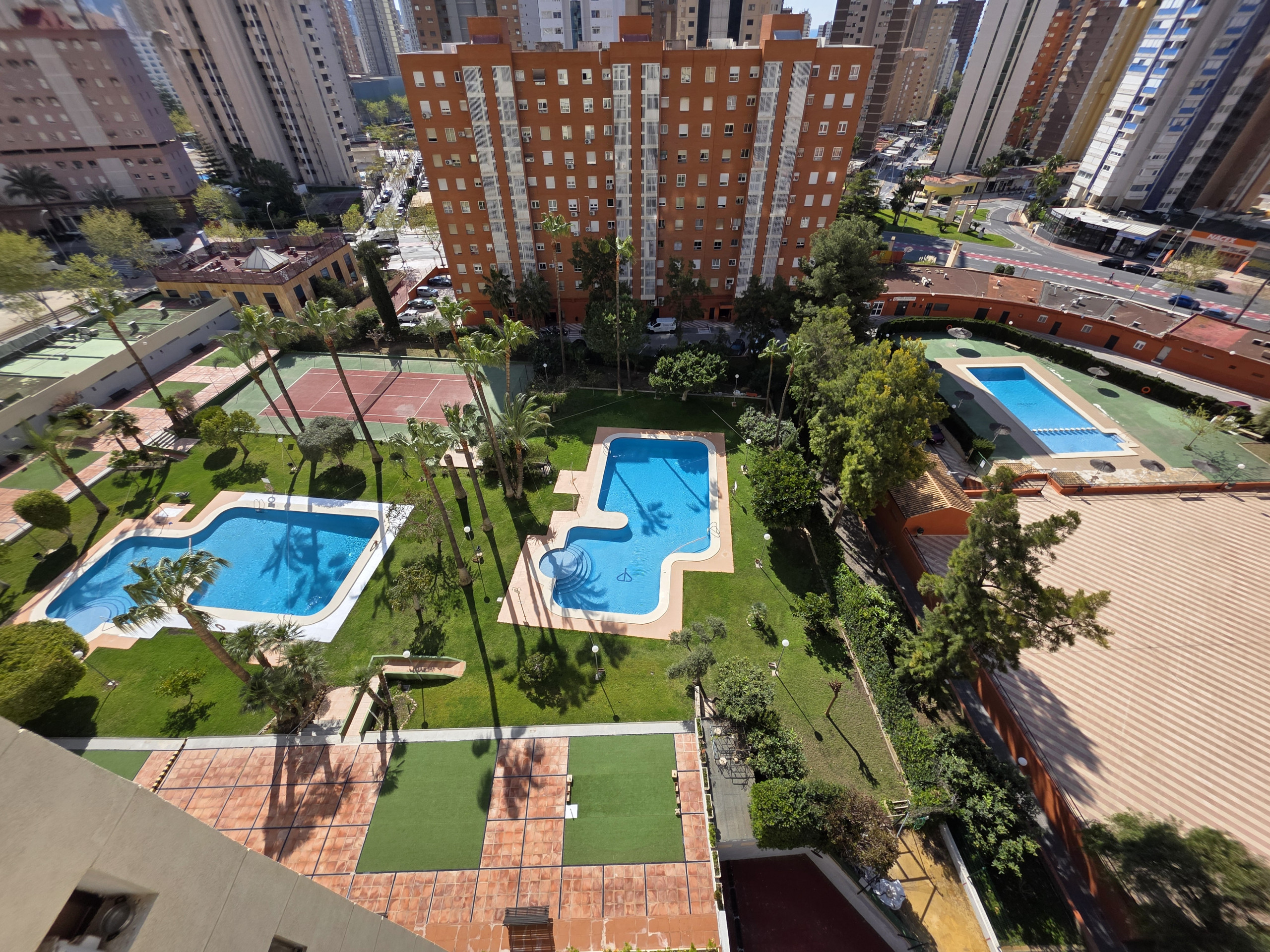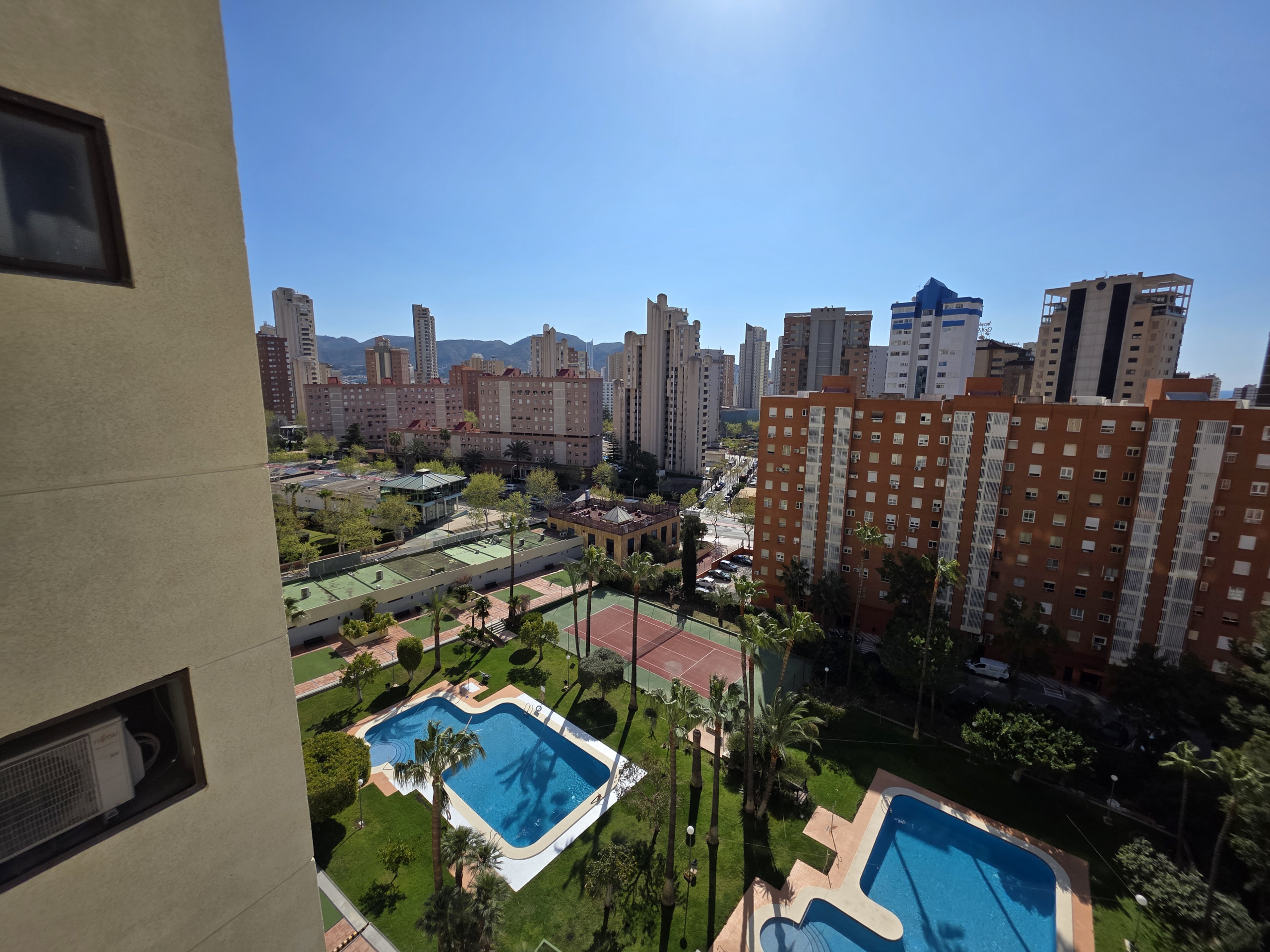 Dispone de ascensor, lavadora, plancha, acceso internet (wifi), secador, zona infantil, pista de tenis, aire acondicionado, piscina comunitaria+infantil, parking aire libre en edificio cercano, 2 Televisores.
