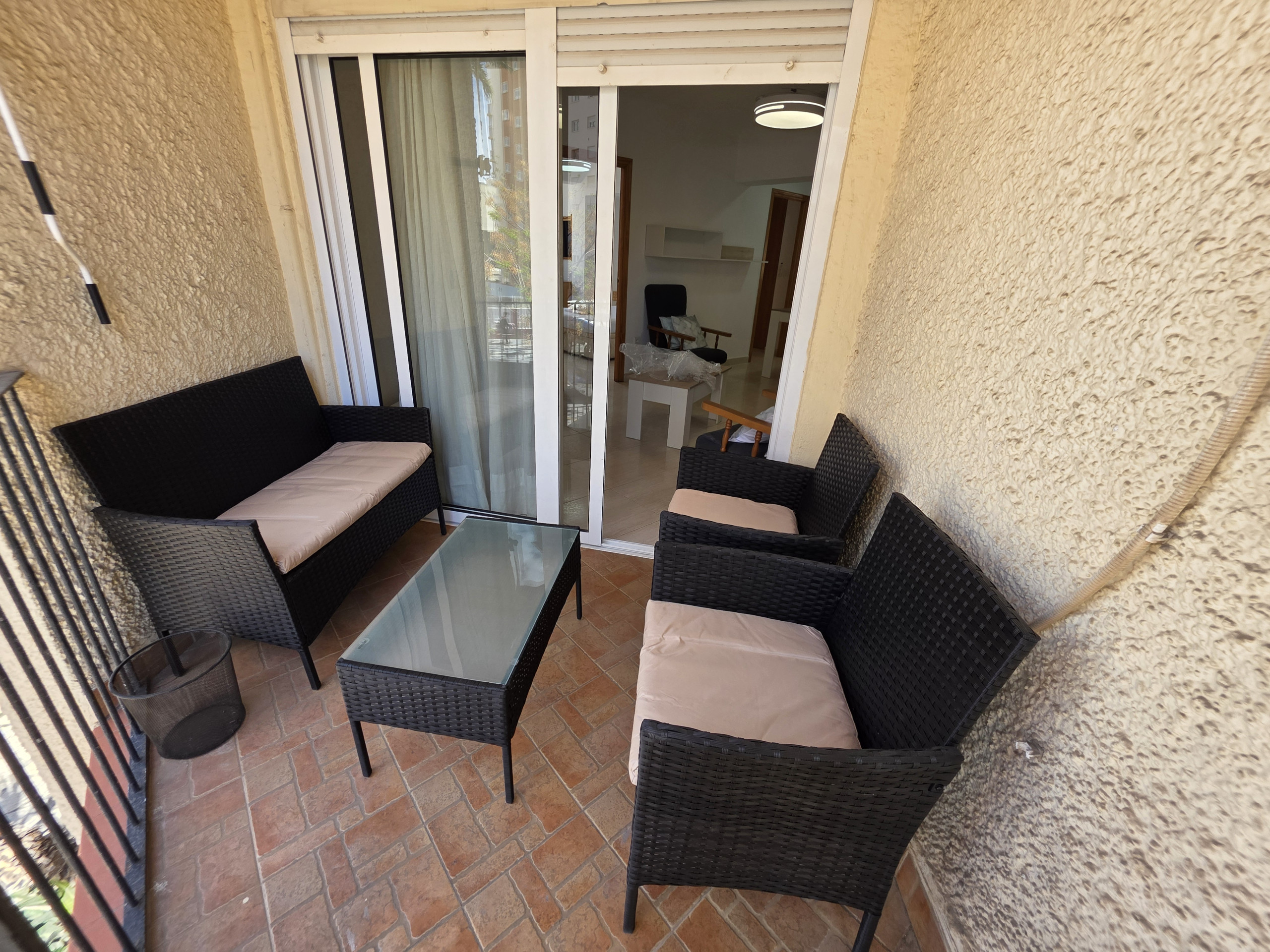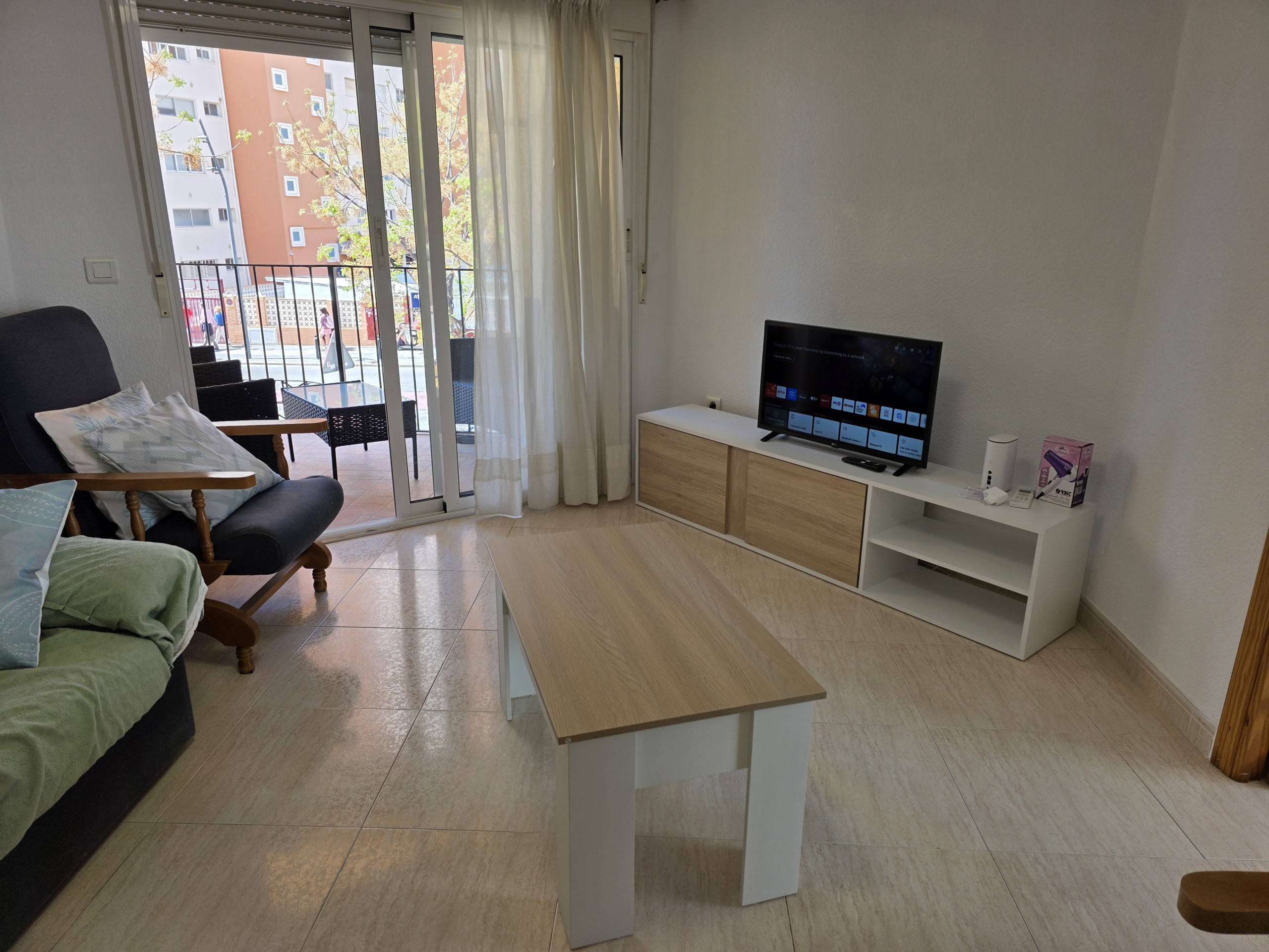 Dispone de mobiliario jardín, lavadora, plancha, secador, balcón, aire acondicionado, parking cubierto en mismo edificio, 1 Televisor.